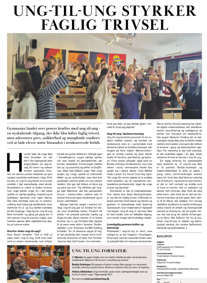 Ung til Ung styrker faglig trivsel - side 2Artikel i Politiken d. 4.12.2025 Læs mere HER Presse Teknologi kan være svaret på børn og unges udfordringer med mental sundhed.- Side 2 og 4Artikel i Politiken d. 23.10.2025 Læs mere HER Podcast omkring mentorordningen på Ørestad Gymnasium